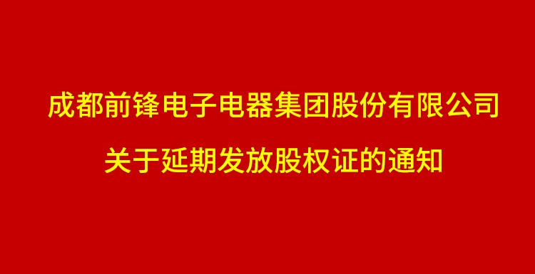 成都前鋒電子電器集團(tuán)股份有限公司關(guān)于延期發(fā)放股權(quán)證的通知全體股東: 為切實做好疫情防控工作,經(jīng)公司研究決定,原定于2021年11月15-1