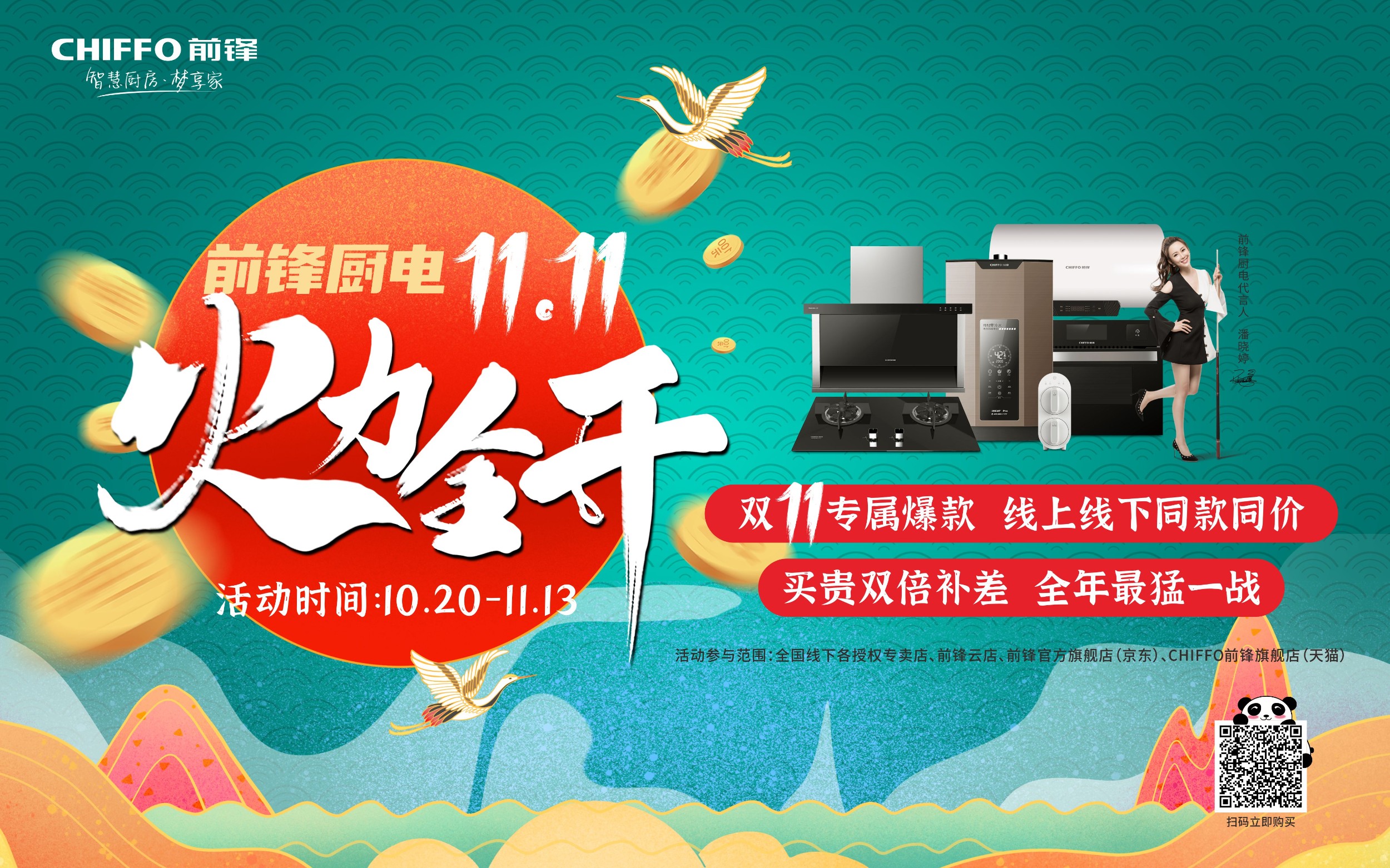 火力全開狂歡開啟 活動(dòng)正式開啟啦!前鋒廚電雙11狂歡盛宴驚艷來襲! 10月20日—11月13日,前鋒廚電火力全開,全國千店同時(shí)