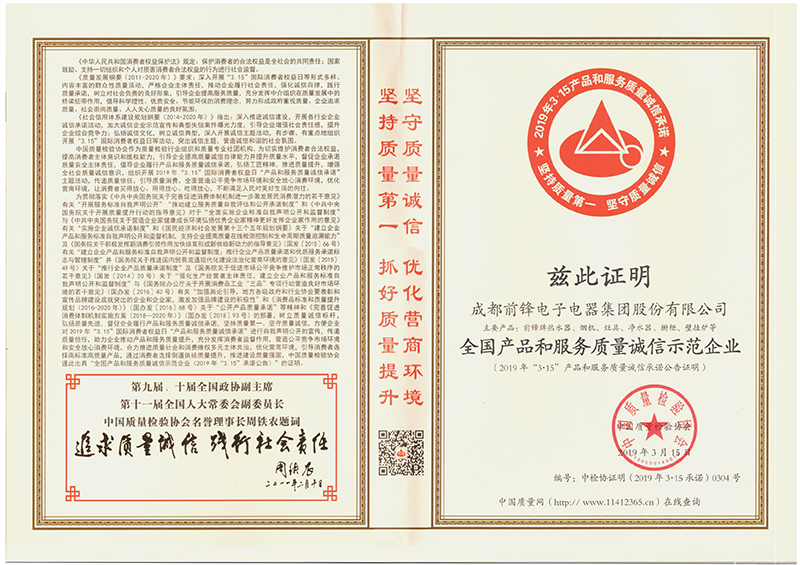 近日,從中國質(zhì)量檢驗協(xié)會傳來喜訊,在中國質(zhì)量檢驗協(xié)會主辦的“2019年3·15產(chǎn)品和服務質(zhì)量誠信承諾”主題活動中,成都前鋒電子電器有限股份公司憑借優(yōu)質(zhì)的質(zhì)量,完善的售后服務,較高的品牌信任度,榮獲“全國產(chǎn)品和服務質(zhì)量誠信示范企業(yè)”榮譽稱號。